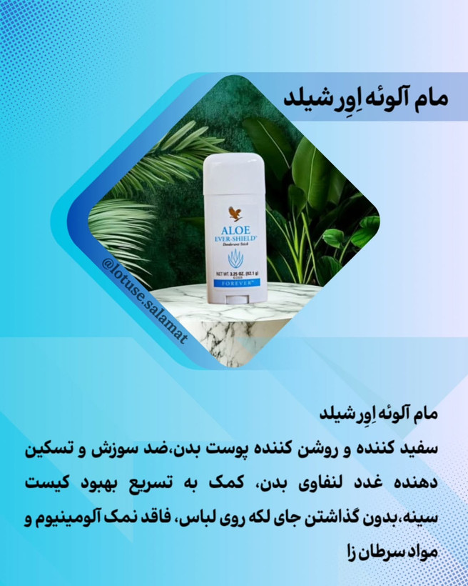 فاقد نمکهای آلومینیوم، فاقد الکل، پایه صابونی و کاملاً طبیعی. حاوی آلوئهورای خالص، مناسب برای پوستهای حساس. عطری ملایم و نامحسوس.