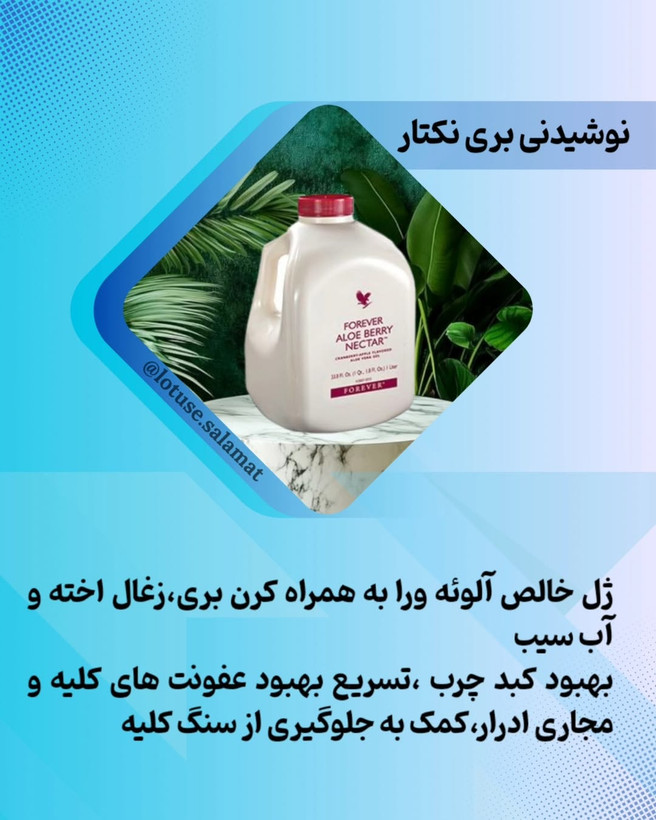 نوشیدنی بری نکتار ژل ۱۰۰ درصد خالص آلوئه ورا به همراه آب سیب،کرن بری و زغال اخته منبع طبیعی و عالی آنتی اکسیدان ها مفید برای سلامتی مجاری ادرار کمک به جلوگیری از سنگ کلیه تسریع درمان عفونتهای کلیه جلوگیری از بروز و پیشرفت عفونت های معده بهبود کبد چرب پاکسازی و سمزدایی بدن.